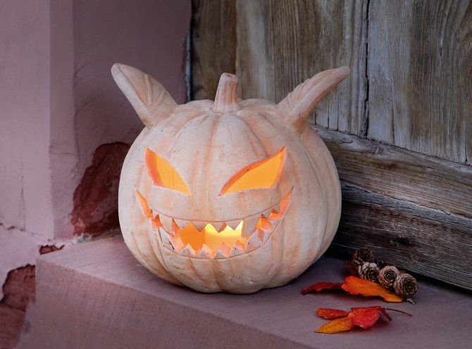 На Хэллоуин традиционно украшается жилище оранжевым плодом с осеннего урожая. Из тыквы вырезают мило улыбающиеся или с жутким оскалом рожицы. Если выбрать внутренности с семечками и вставить внутрь тыквы свечу, получится светильник Джека: как вырезать тыкву на Хэллоуин: фото, идеи, декор.